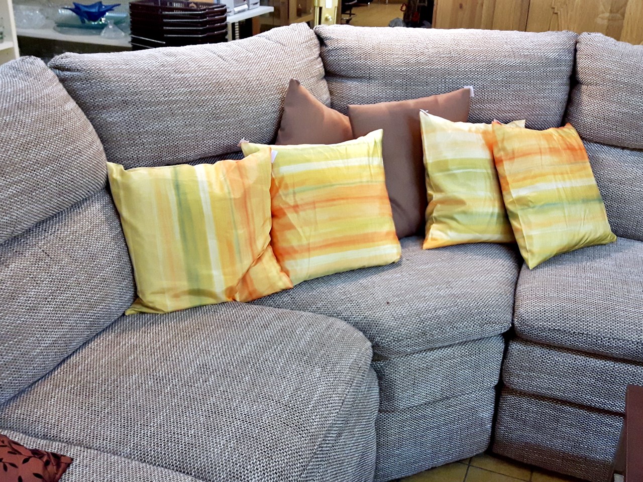 Passend dafür haben wir für euch eine super tolle Couchgarnitur. Der Bezug besteht aus strapazierfähigem Stoff in neutraler Farbgebung graubraun meliert. Perfekt geeignet für große Räume, denn die Abmessungen können sich sehen lassen. Die Wohnlandschaft misst von vorne gesehen in der Breite 370 cm, und in der Tiefe links 273 cm und rechts mit dem Recamiere 163 cm. Sie hat eine Tiefe von 90 cm und eine Lehnenhöhe von 94 cm.
