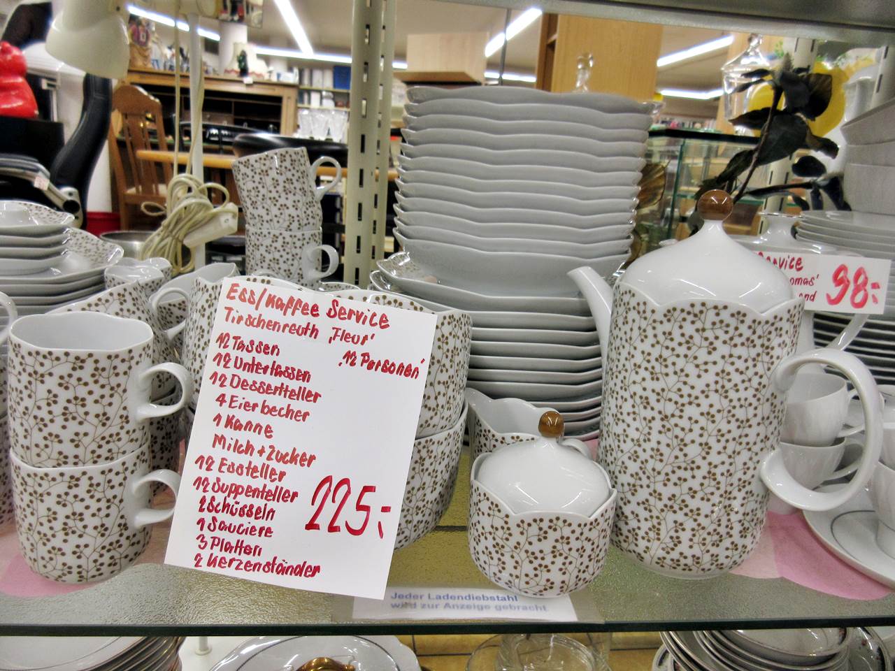 Wir haben für jeden Geldbeutel etwas da, denn unser Angebot ist breit gefächert. Neben einfachem Porzellan haben wir Serien von Rosenthal, Seltmann Weiden, Melitta, Thomas, Villeroy & Boch und vielen anderen namhaften Herstellern. Und auch ganz besonders wertvolle Porzellan-Serien sind immer mal dabei. Bei uns findet ihr komplette Kaffee- und Essservices, oder auch Einzelteile aus verschiedenen Serien.