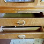 Der Schrank ist schätzungsweise aus den 50er/60er Jahren und hat dementsprechend auch altersbedingte Gebrauchsspuren. Ihr könnt den Schrank komplett restaurieren oder auch nur aufpolieren. Soweit wir sehen konnten, gibt es keine auffälligen Beschädigungen.