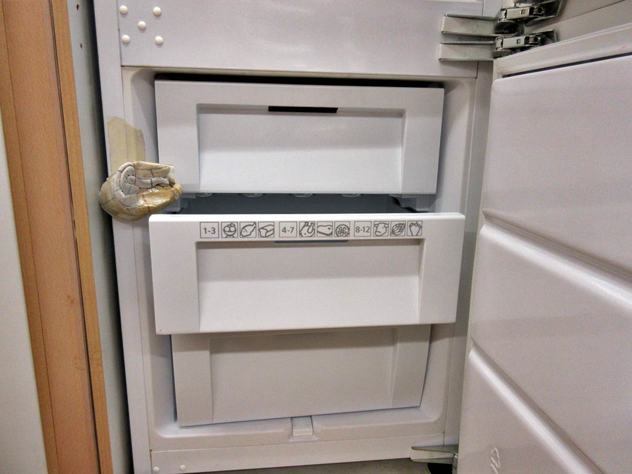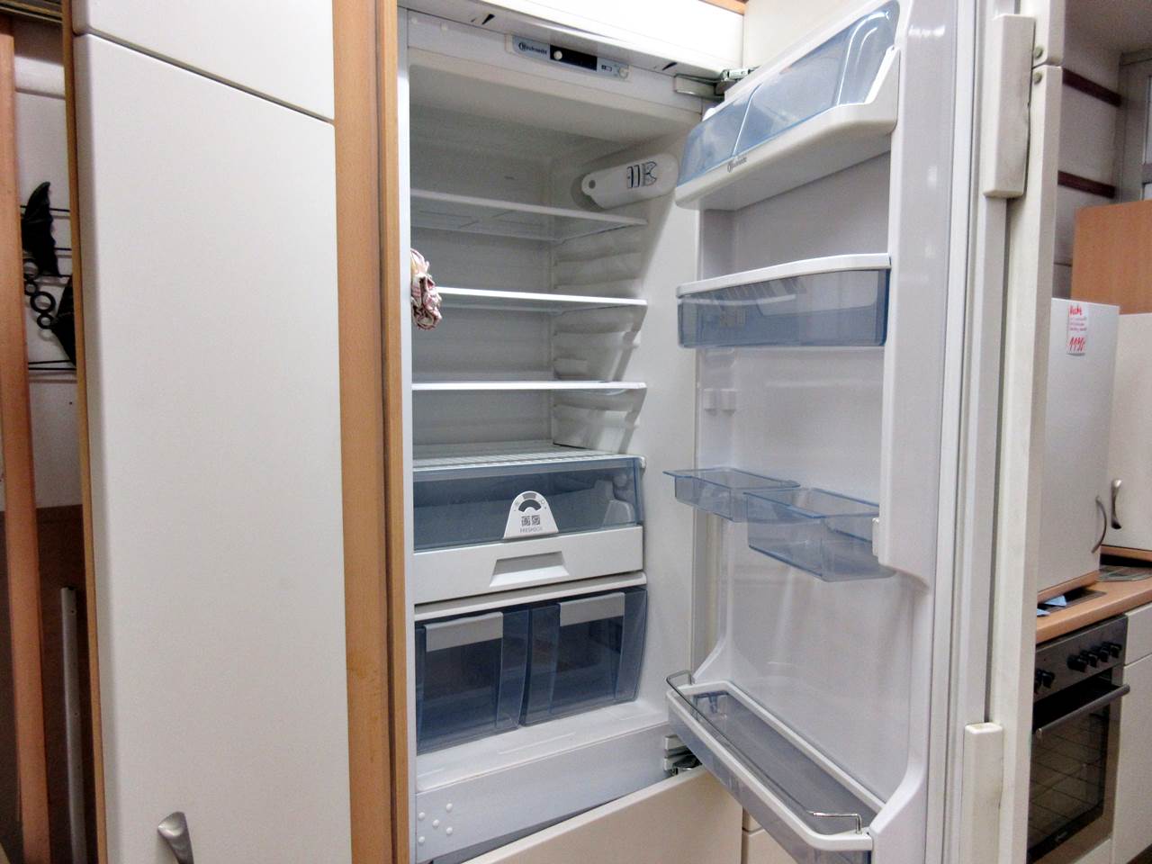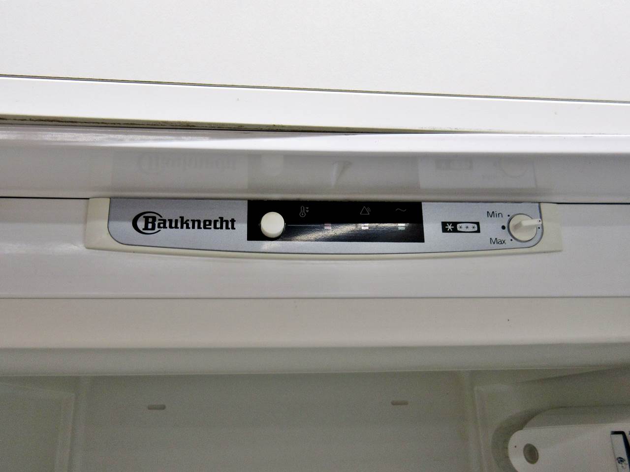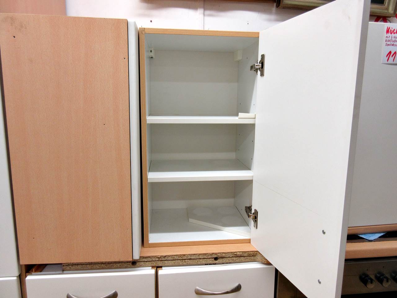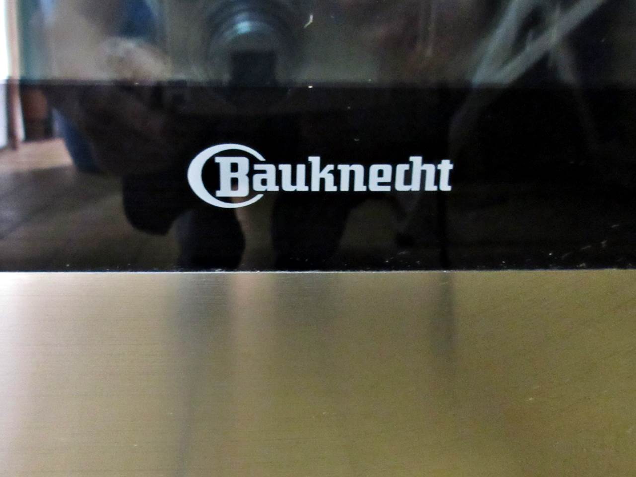Die Küche hat weiße Fronten und einen Korpus in der Farbe Buche. Durch vorhandene Eckschränke bietet die Küche verschiedene Einbauvarianten. Mit dabei sind E-Geräte von Bauknecht: Ceranfeld, Backofen, Dunstabzug, ein Kühl- und ein Gefrierschrank. Ebenso eine Edelstahlspüle mit Rundbecken, Armatur und Arbeitsplatte. Ein praktischer Apothekerschrank bietet jede Menge Stauraum und unter der Spüle versteckt sich ein Hailo-Abfalleimer.