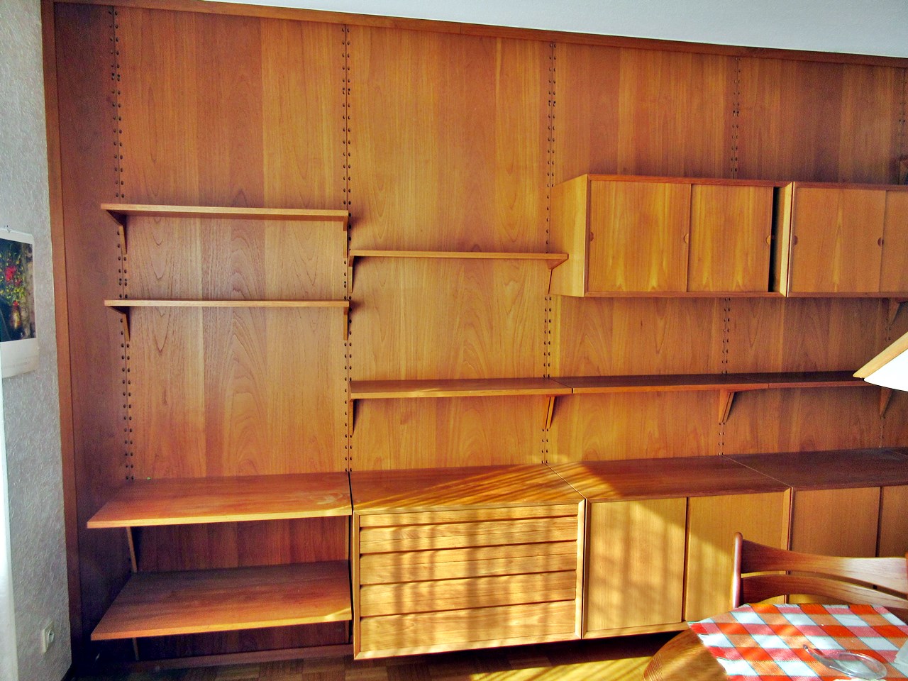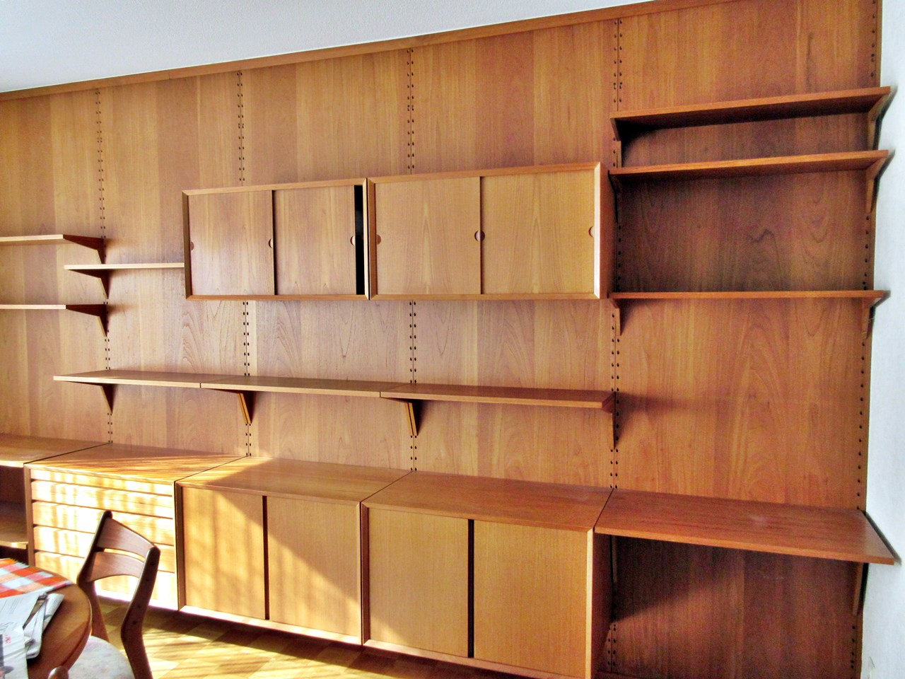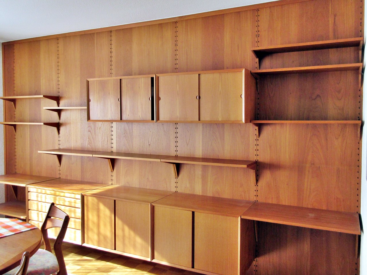 Dieses Regalsystem ist ein echter Designklassiker. Die einzelnen Regalbretter und Schränke werden an Wandpaneelen befestigt und lassen sich so individuell aufbauen. Eine ganz große Besonderheit ist auch, dass die komplette Holz-Rückwand dabei ist.