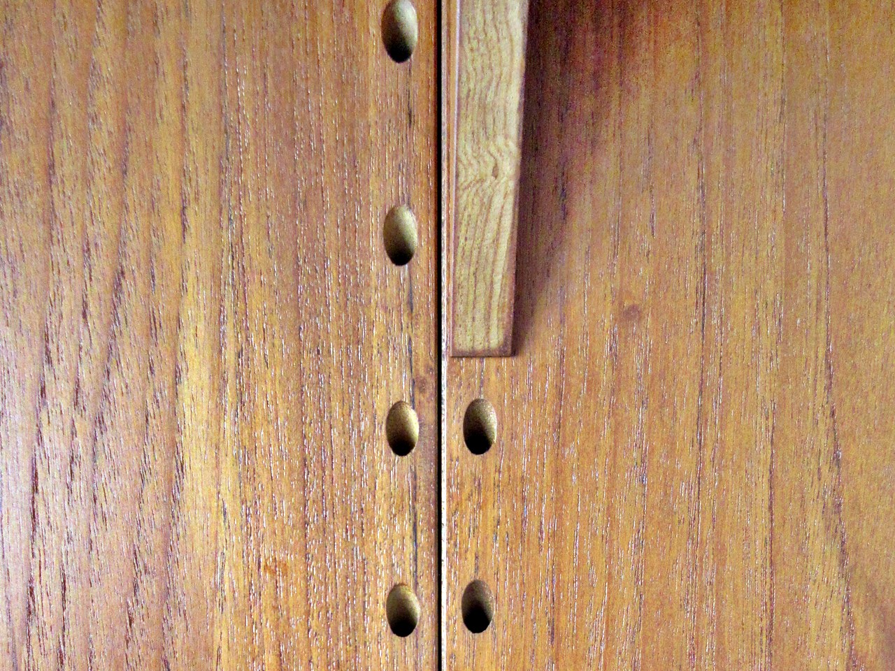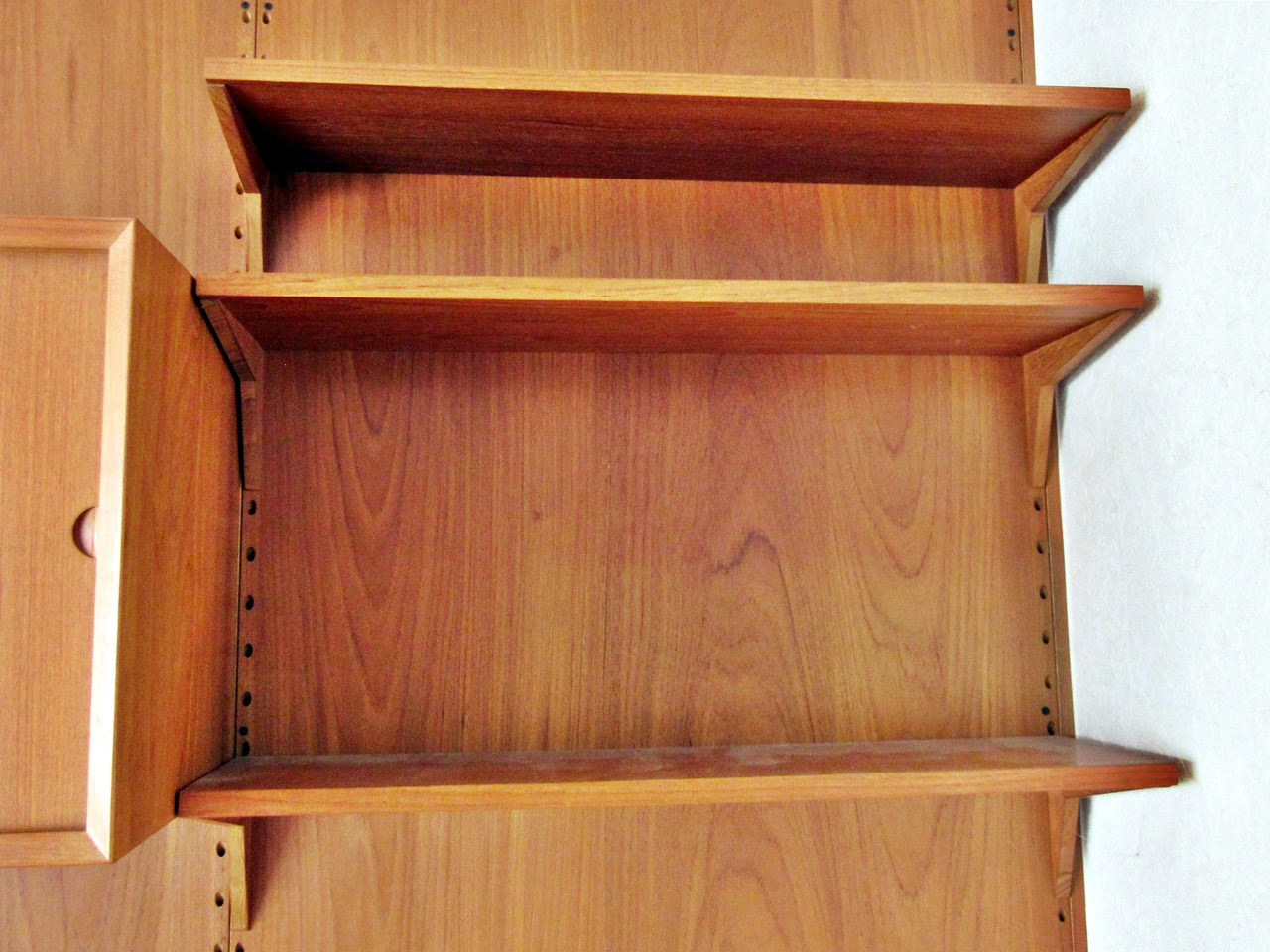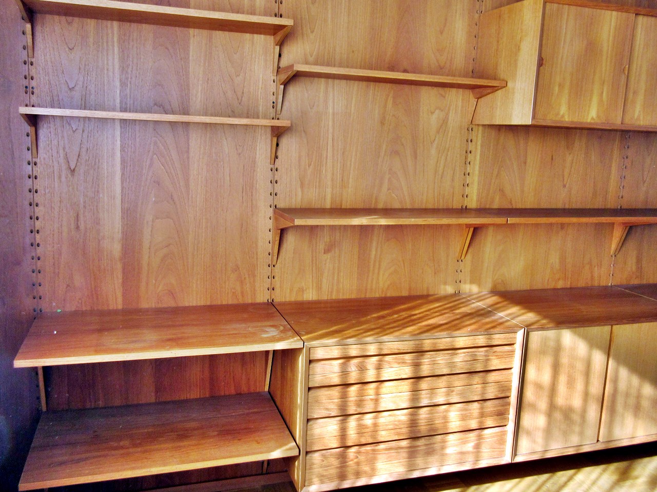 Dieses Regalsystem ist ein echter Designklassiker. Die einzelnen Regalbretter und Schränke werden an Wandpaneelen befestigt und lassen sich so individuell aufbauen. Eine ganz große Besonderheit ist auch, dass die komplette Holz-Rückwand dabei ist.