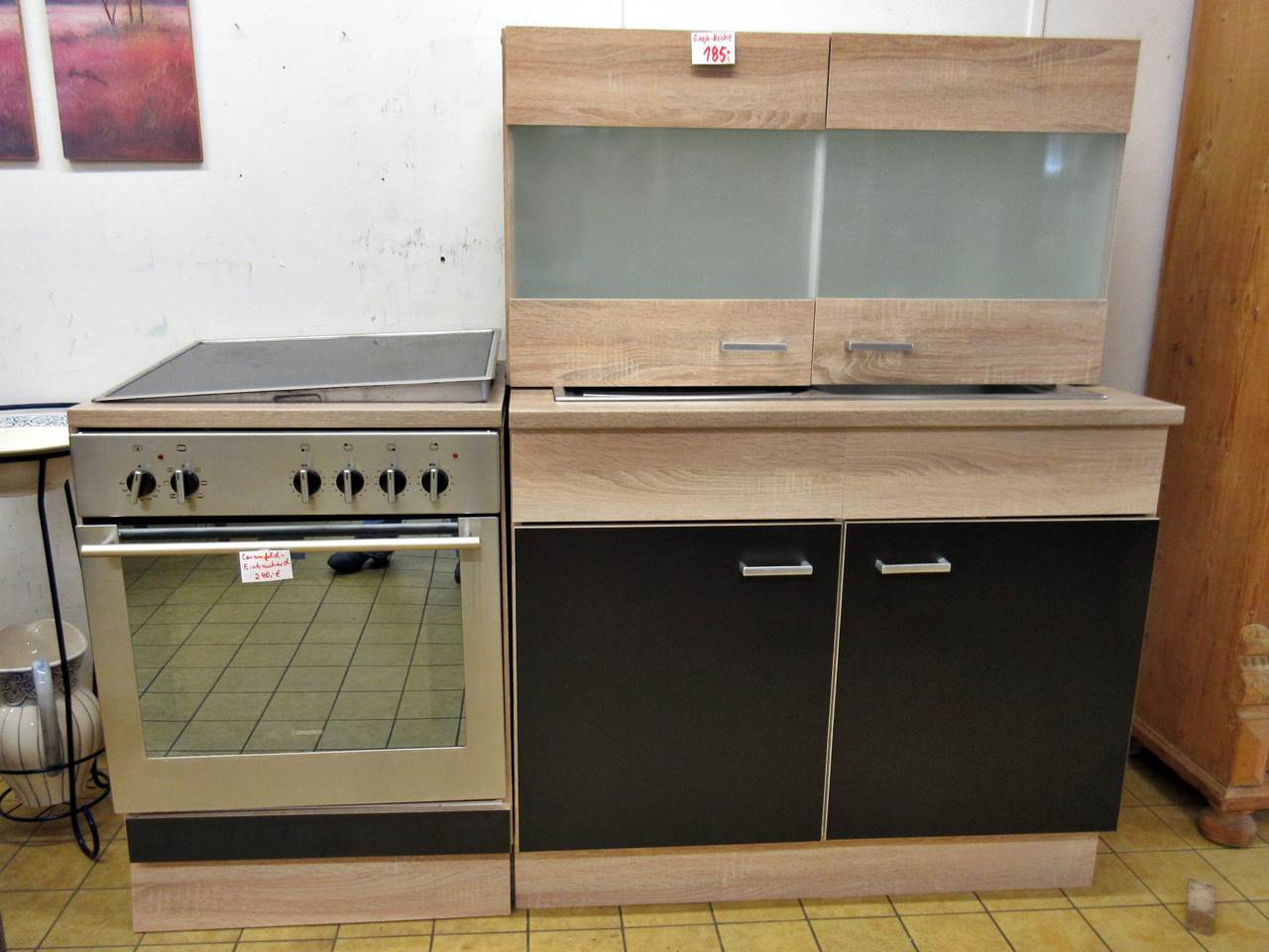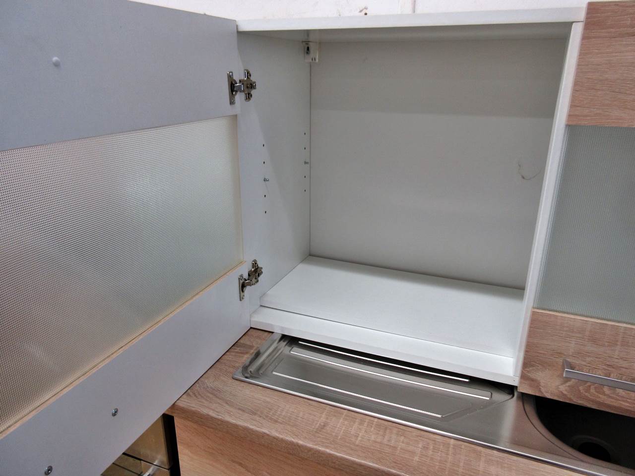 Wer nur begrenzten Platz zur Verfügung hat oder eine kleine Teeküche sucht, sollte sich das gute Stück mal ansehen. Die Küche besteht aus einem Herd-Unterschrank und einem weiteren Schrank mit Edelstahl-Spüle. Beide Elemente zusammen haben eine Länge von 160 cm. Der dazugehörige Hängeschrank ist 100 cm breit. Auf den Bildern ist ein Backofen mit Ceranfeld zu sehen, die Küche kann mit oder ohne Herd gekauft werden. Ein Kühlschrank muss als Standgerät separat gestellt werden.
